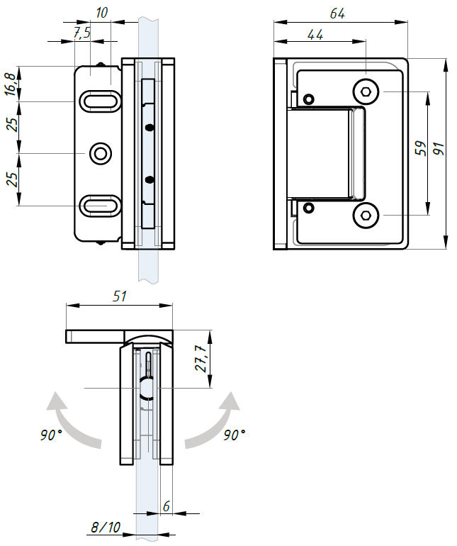 Band mit Seitenbefestigung mit Arretierung ± 90° (Glas - Wand), chrom glänzend