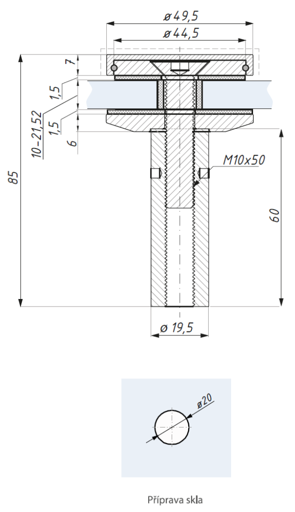 Bodový úchyt s nástavcem s krytkou, sklo 10 - 21,52 mm