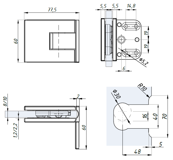 Regulovatelný závěs s bočním kotvením s aretací ±90° (sklo - zeď 90°), lesklý chrom