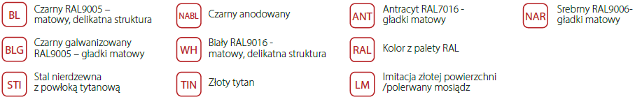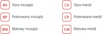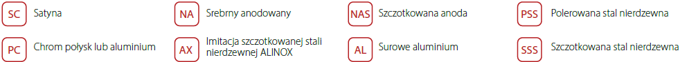 W nagłówkach kolumn cennika podano oznaczenia wykończenia powierzchni produktu. Wygląd wykończenia powierzchni może się nieco różnić w przypadku poszczególnych serii okuć (np. BOLOGNA, VENEZIA). Jest to uwarunkowane rodzajem materiału użytego do produkcji konkretnego produktu (np. mosiądz, stal nierdzewna, aluminium) jak również zależy od technologii wykończenia końcowego (np. galwanizacja, anodowanie lub lakierowanie). |