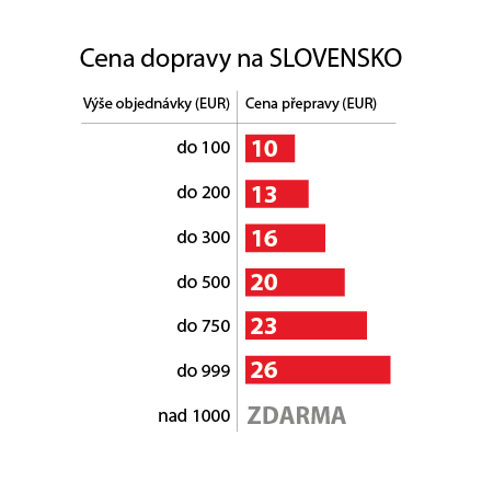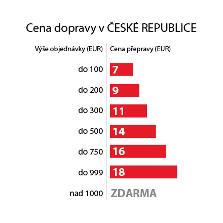 Cena přepravy je závislá na výši objednávky. Jednotlivé tarify najdete přehledně v grafu viz níže. Při objedání v eshopu bude částka za přepravu zobrazena v souhrnu objednávky (v záložce Kontrola dat). V případě odeslání několika objednávek z různých košíků během jednoho dne a jejich odesílání jednou přepravou bude účtovaná částka přepravy dle celkové ceny objednávek.